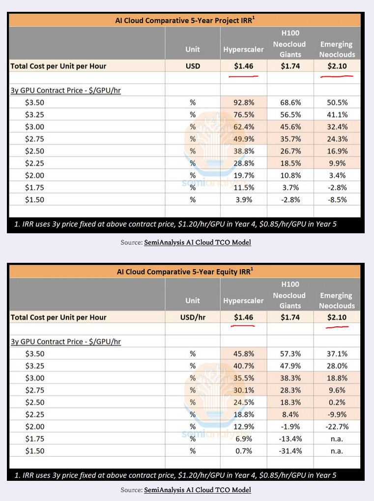 Semianalysis own financial modeling shows how precarious these neoclouds financials are relative to hyperscalers.