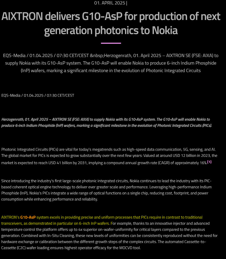 Aixtron ( $AIXA.DE ) is a semicap company I have started to research because I want more exposure to optics but buying more Lumentum is retarded at this point.