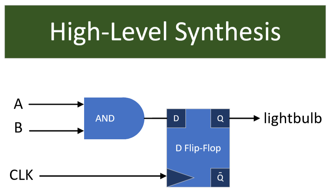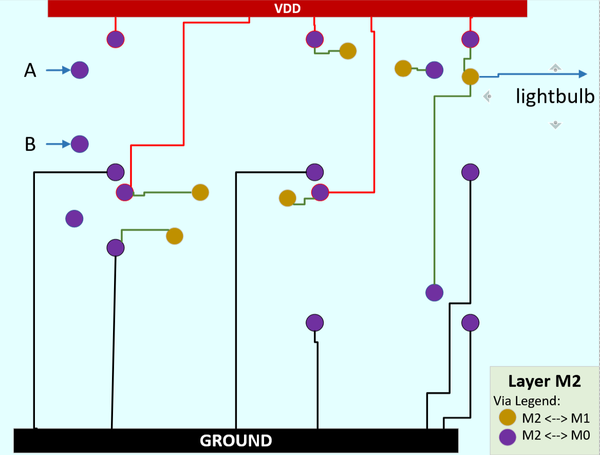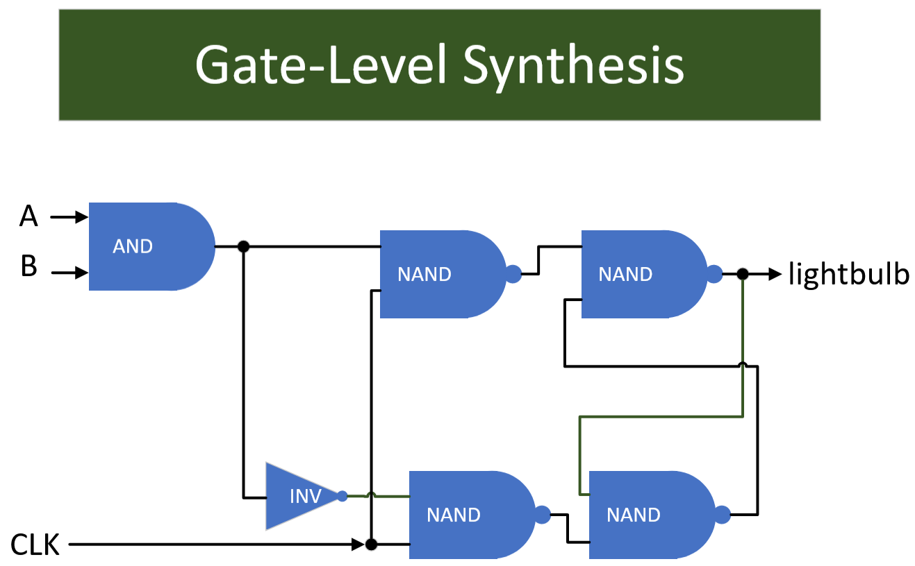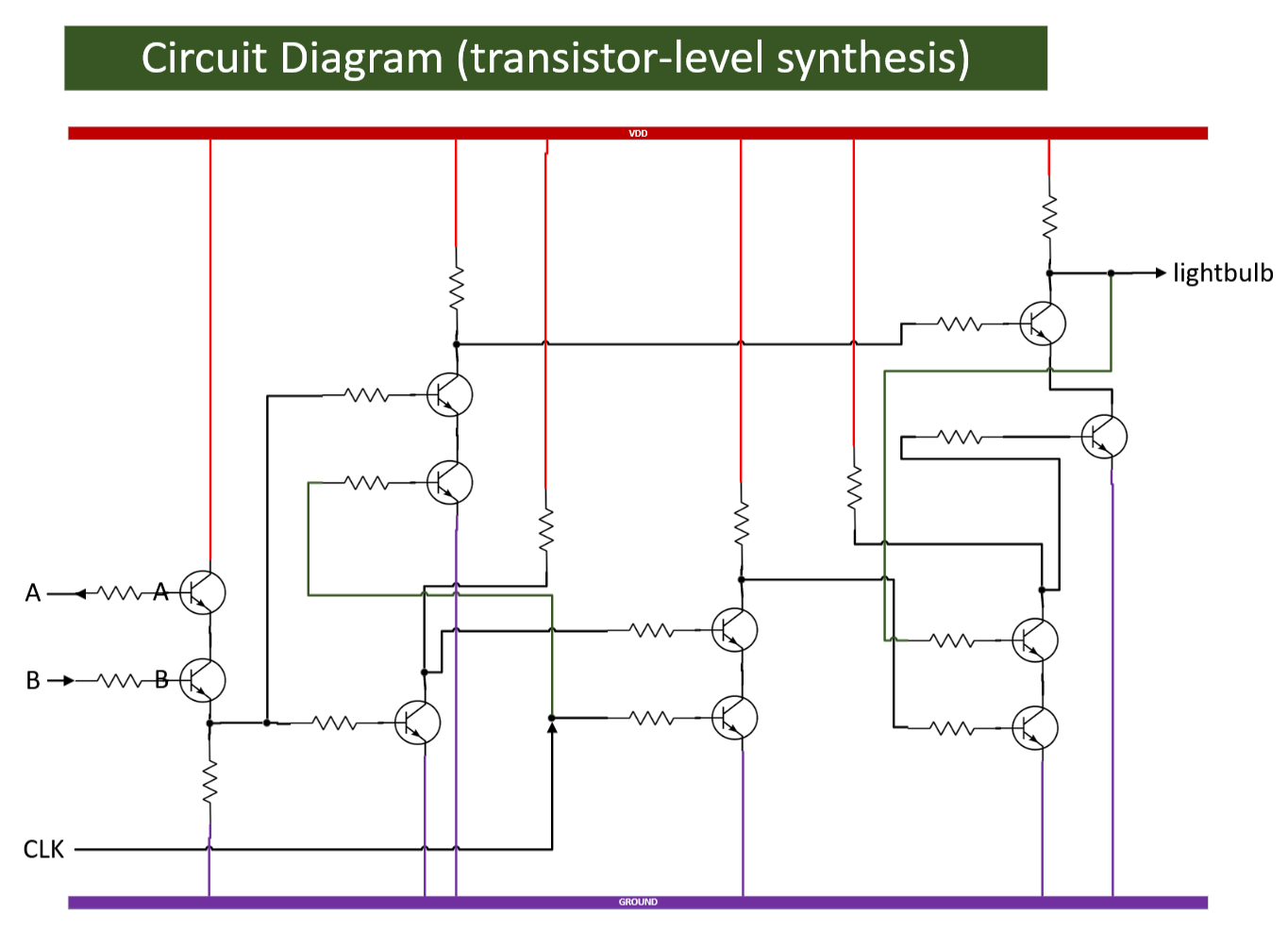 We now have a physical circuit with power (voltage rail // VDD), ground, inputs (A, B, CLK), and output (lightbulb).