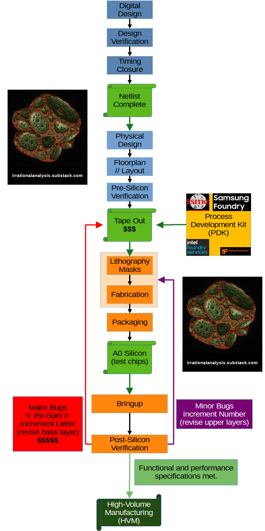 If there are major problems, the chip must undergo a “re-spin”. This industry term means a bug/issue is so severe, it must be fixed in the base-layer, incurring huge costs upon the design company.