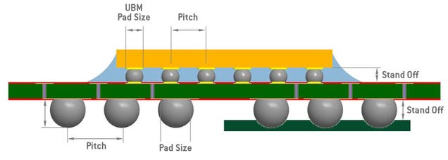 Tiny solder balls can then be used to place the package onto a larger board/PCB.