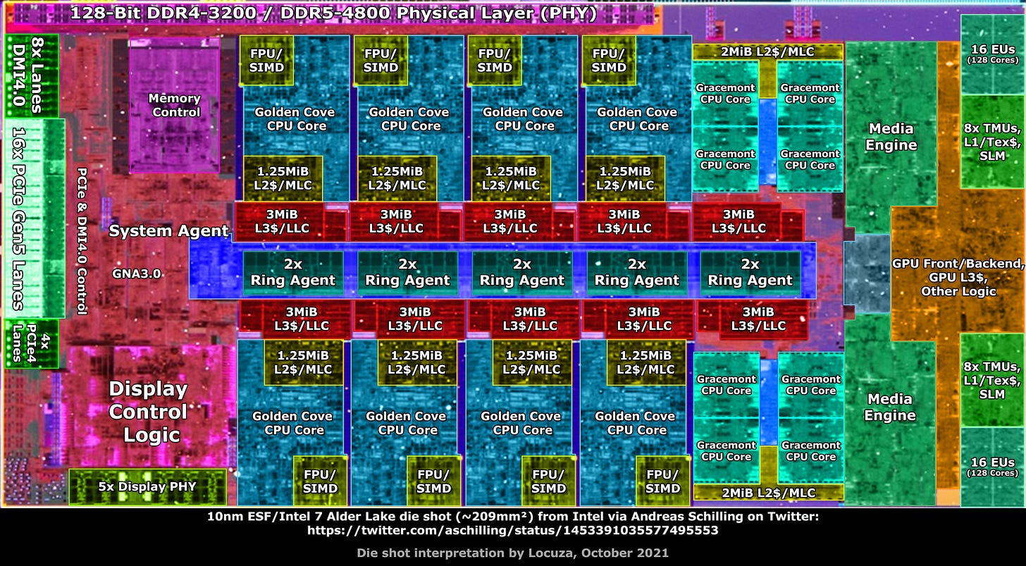 Above is a labeled block diagram of an Intel client (laptop) chip. The big CPU core design (Golden Cove) is re-used for Intel’s server chip codenamed Saphire Rapids. A few modifications are made (slightly different cache configuration) but the design block is largely re-used from the original netlist delivered by the Golden Cove team.