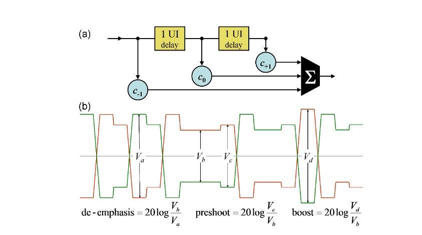 A standard ethernet transmitter has 5 Tx FIR taps. Standards documents denoted them as c(-3, -2, -1, 0, 1), indicating there are three pre-emphasis taps and one post-emphasis tap.