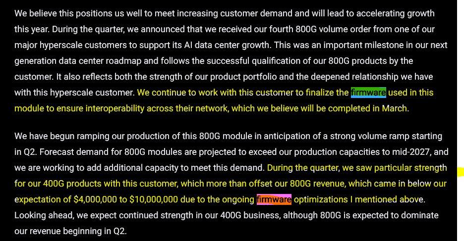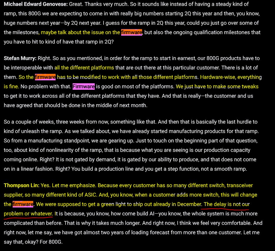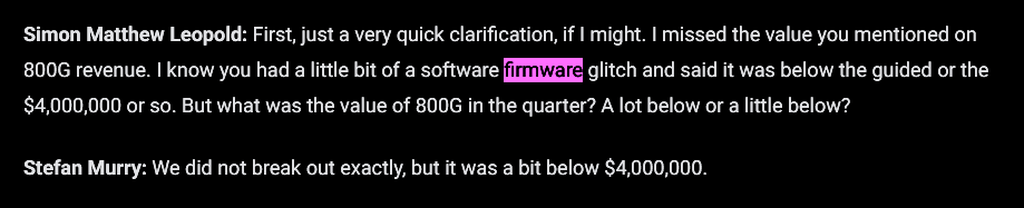 AAOI CEO explicitly stated that the firmware issue is “not our problem or whatever” which implies that AAOI is complying with spec but for some reason fails interop with some customer equipment. Could be a particular model of switch or version of ASIC.