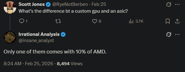At this rate, Dr. Lisa Su is going to sign so many 10% warrant deals that in a few years AMD will be an industry consortium which exists to encourage Jensen to lower margins by 200 bps.