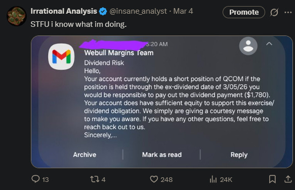 Weather you lose or make money by reading this publication, not my problem. Preferably you make money I guess but all responsibility is washed from my hands due to how transparent my holdings are. Nobody else on the internet is retarded enough to screenshot entire book regularly and upload full account statements with all trading records publicly.
