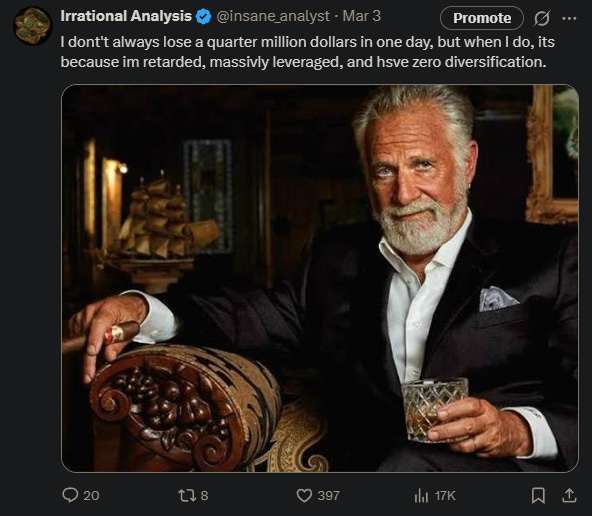 I regularly publish my holdings, with average price, for multiple reasons. One reason is I am a massive arrogant narcissist and take great pleasure in dunking on people online. But the main reason is an extreme paranoia for ethical issues. It deeply concerns me that someone might have the perception I am pumping shit or writing stuff (positive or negative) due to financial motivations.