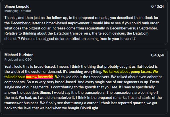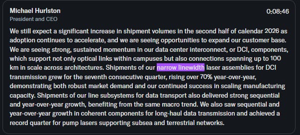 TRY TO FIND ANY LUMENTUM COMPETITOR MAKEING PUBLIC CLAIMS ON LASER LINEWIDTH FOR HIGH-POWER (300mW+) DFB AT O-BAND.