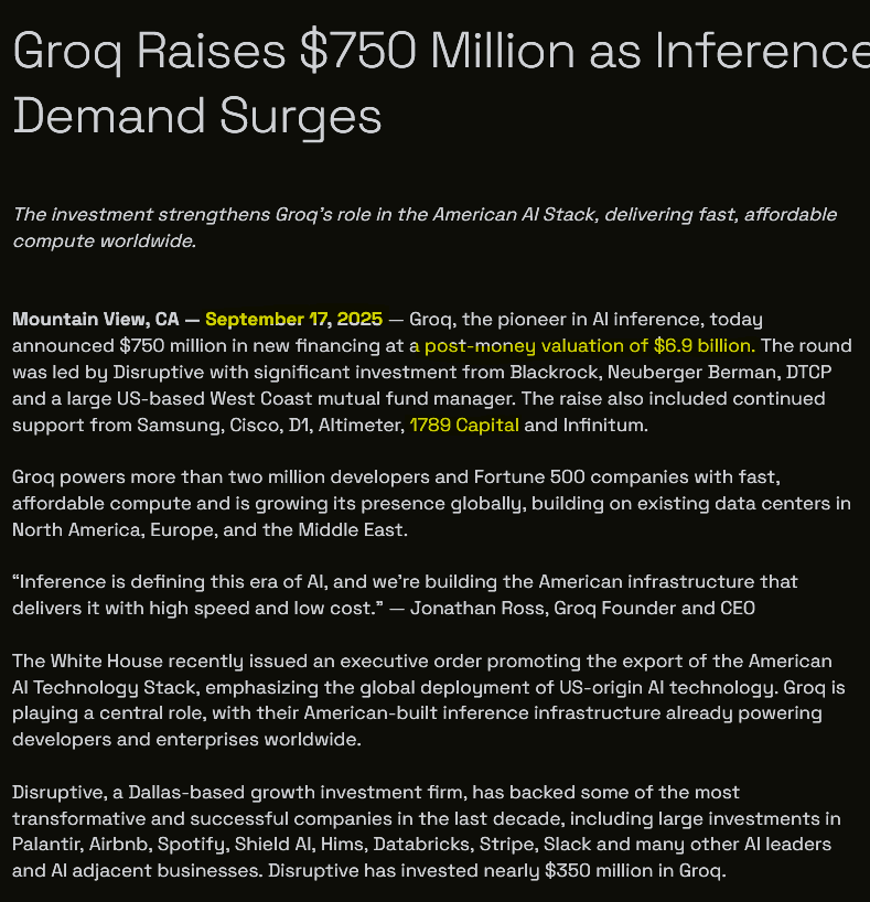Groq raised LITERALLY LESS THAN THREE MONTHS BEFORE NVIDIA DEAL at a $7B valuation. Don Jr VC firm (1789 Capital) was in the round.
