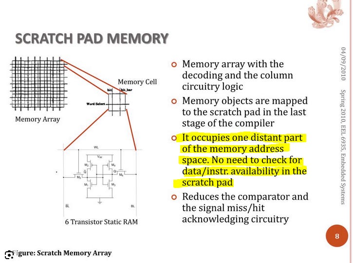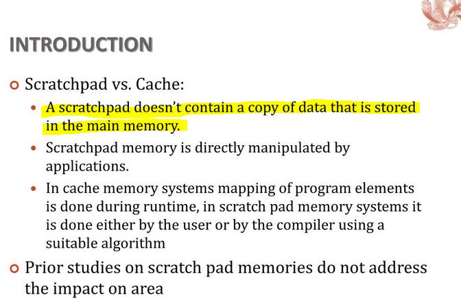 If software makes these decisions, the SRAM (still on-chip memory) is a “scratchpad”, NOT A CACHE.