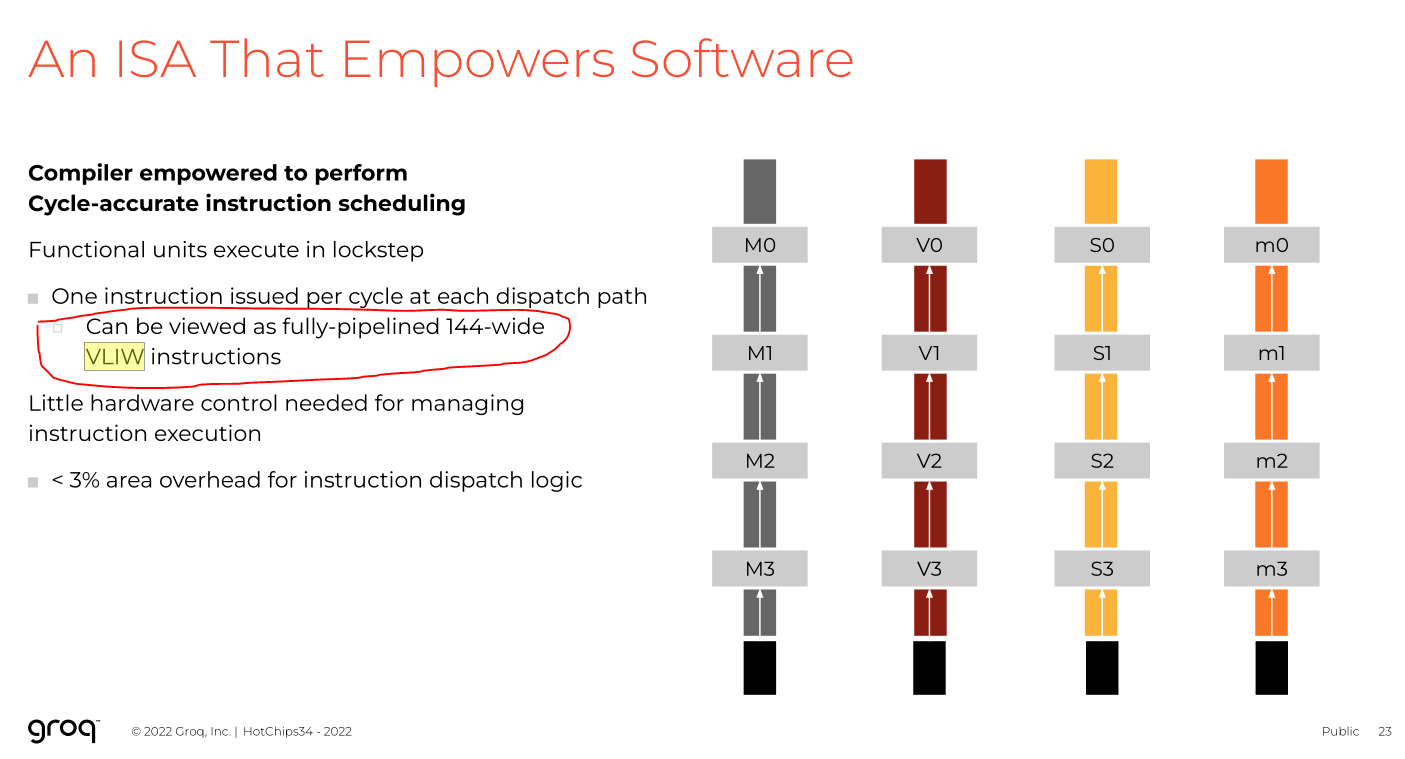 Groq’s own public presentation at Hot Chips 2022 EXPLICATLY ADMITTED THE ARCHITECTURE CAN BE VIEWD AS 144-WIDE VLIW.
