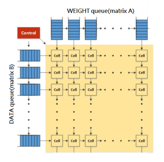 Scratchpad SRAM. Compiler has to cycle-accurate schedule everything ahead of time.